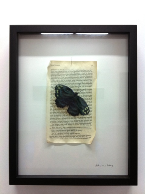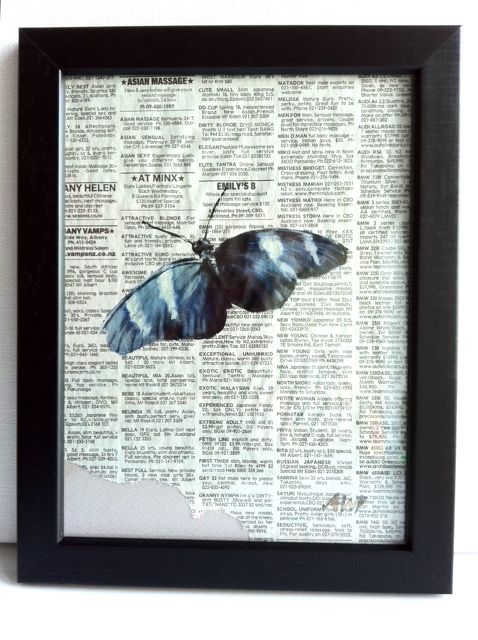 I extracted pages from novels and newspapers specifically chosen for their content and painted a intentionally chosen image upon it. e.g: the image of the bird represents flight, painted onto the newspaper clipping of cars for sale (a form of transport); butterflies representing fleeting moments are painted upon pages from classic novels with themes of love, marriage and society.