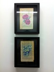 Pink Camellias + Blue white roses (separate)8×10 framed, painting on novel pages