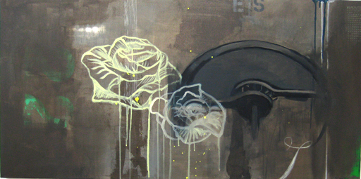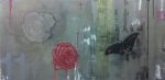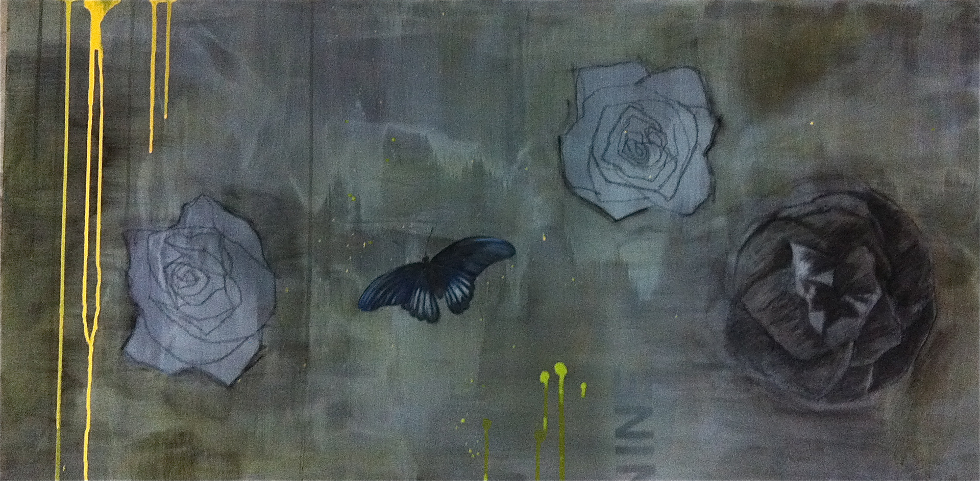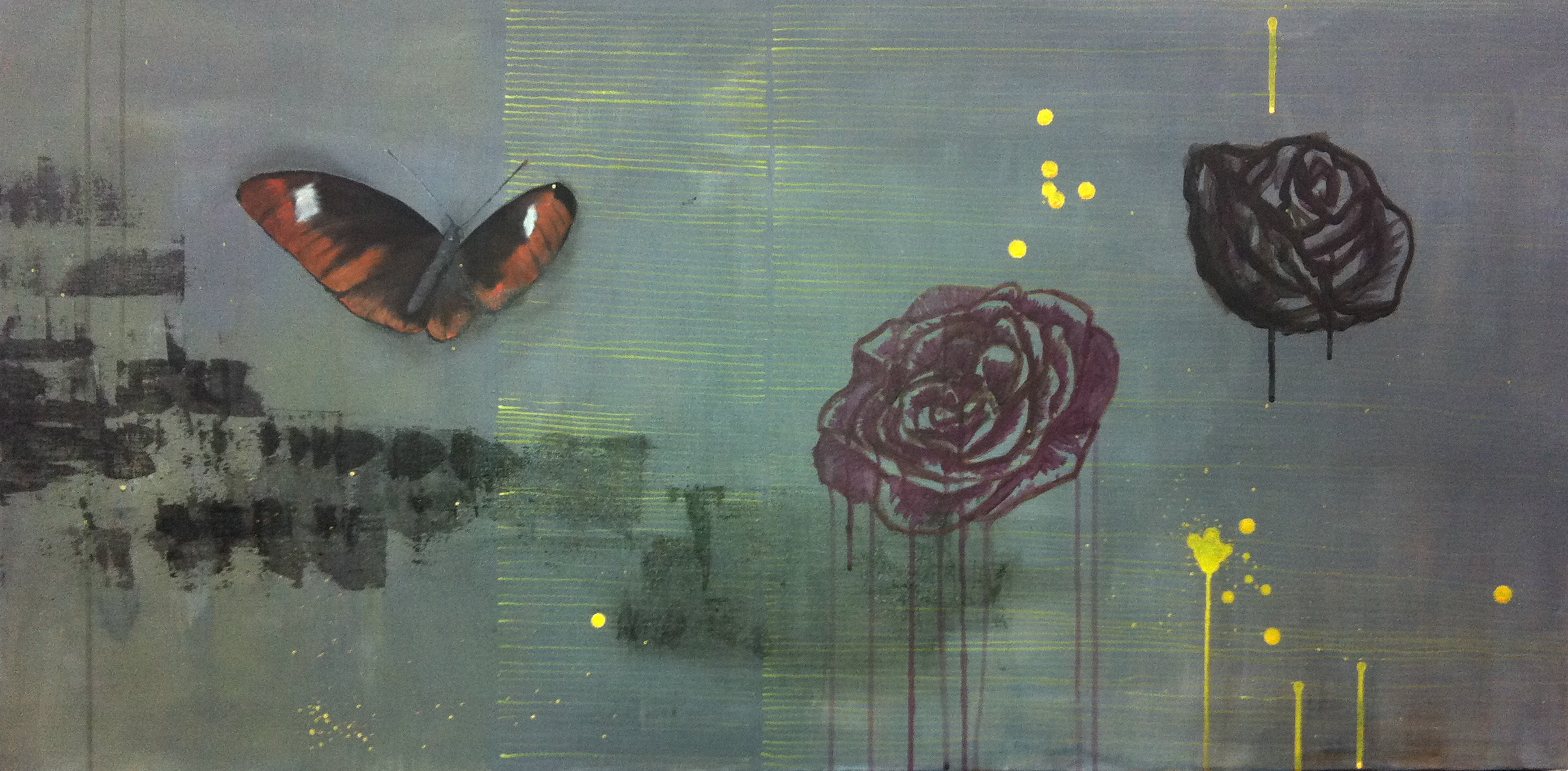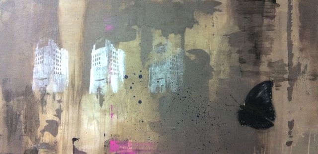 These paintings incorporate abstract with realist painting styles. I mixed up techniques such as screenprinting, spraypainting, charcoal and graphite drawing, with good ol’fashioned oil painting that allowed me to portray botanical details. The butterflies and flowers symbolise what appears to be delicate but has hidden strength and temporary beauty. A reoccurring theme in my art is nature versus the urban.